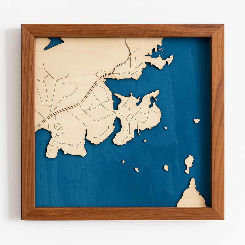 Den här handgjorda 3D-kartan visar området runt Bönan utanför Gävle – där skogen möter havet och horisonten alltid är nära. Varje detalj är skapad med precision, från de tunna graverade vägarna till det levande djupet mellan land och vatten.